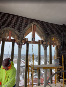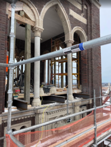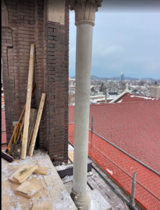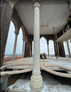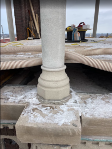 The pictures below show the old columns in their deteriorated state and the new fabricated columns ready to be installed. Also shown, the completed brick and mortar work at the upper most section of the towers.